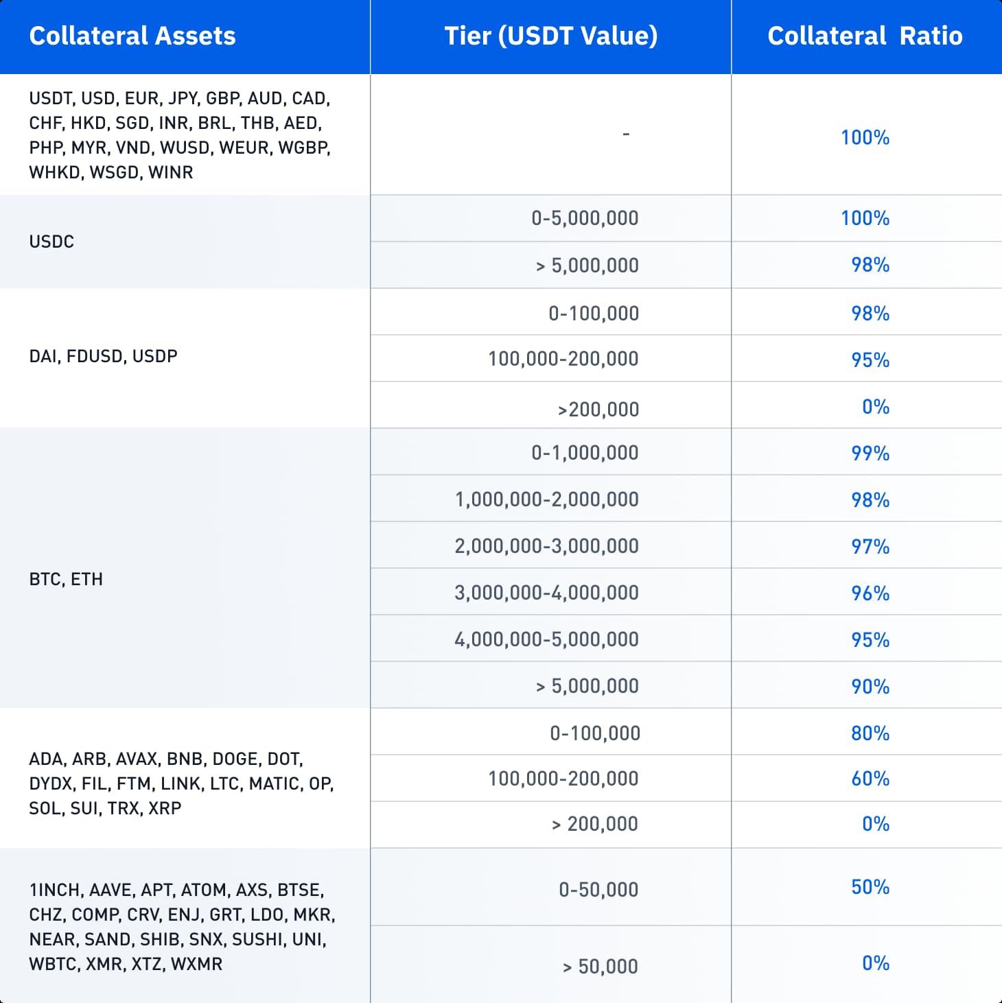 Effective January 24, 2024, we will be adjusting the collateral ratio mechanisms within BTSE’s multi-asset collateral function. Notably, the collateral ratio (haircut) percentage, which is a risk management tool used to determine the borrowing value of your assets, will now be determined based on the collateral’s USDT value rather than the token amount.