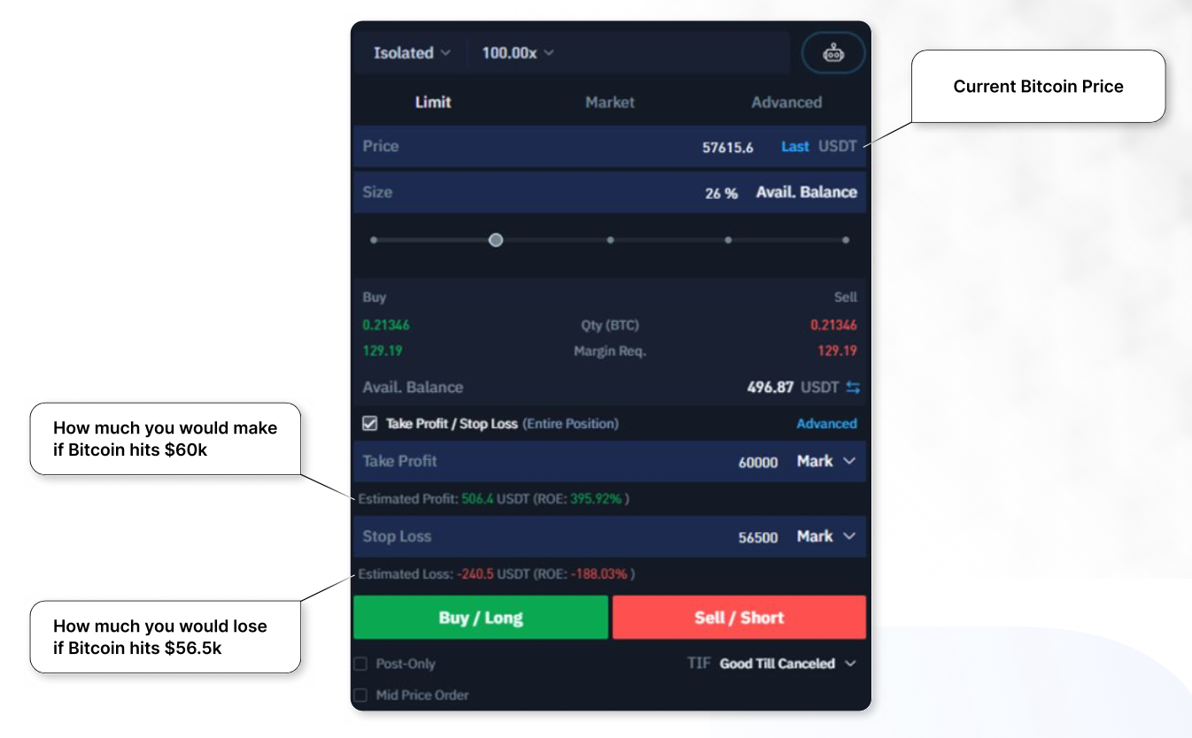 In this scenario, we use 26% of our available balance on a BTC-PERP, 100x leverage position (129 USDT). We set a take-profit mark at a Bitcoin price of $60,000 and a stop-loss mark at the $56,500 mark. Note that it shows you how much money you’d make or lose if either of these conditions are hit.